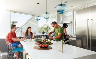 Blue glass pendant lights for kitchen island.